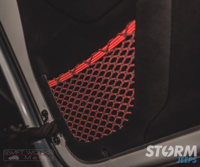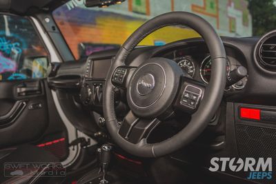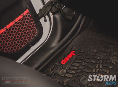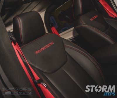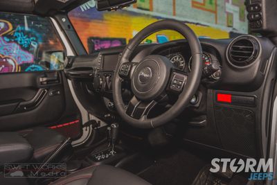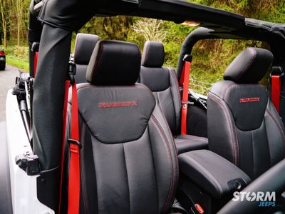 No matter how rough it is outside, it’s all premium inside the Jeep® Wrangler Rubicon Recon. A unique, aggressive style that reveals the extreme nature of the Jeep® Wrangler enriched by black and red finishes and details. The Rubicon Recon features Mckinley leather heated seats with red accent stitching, striking red seat belts, black and red interior netting, 9 speaker Alipne audio system with 6.5” touchscreen media centre with satellite navigation, climate control, cruise control, leather wrapped steering wheel audio and phone controls and the red accents follow through to the all-weather slush mats that protect the interior.