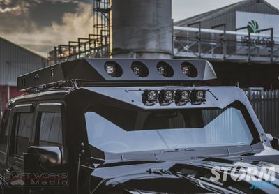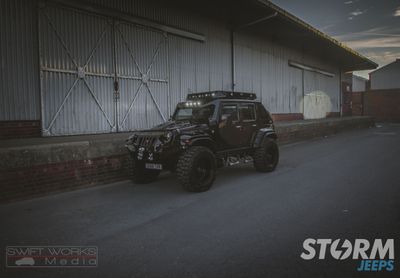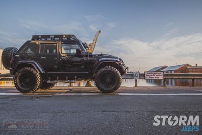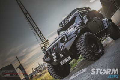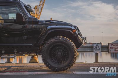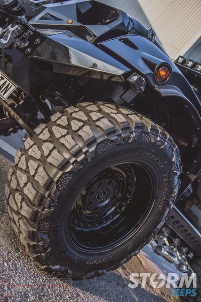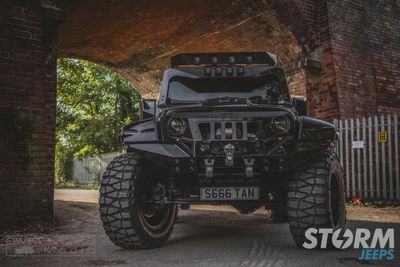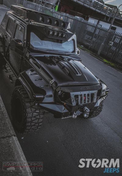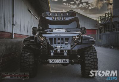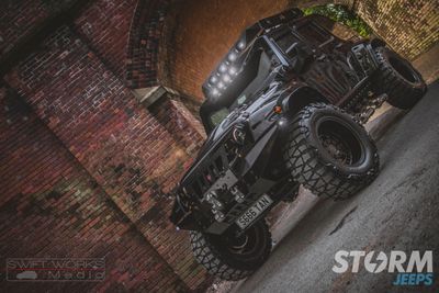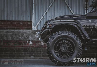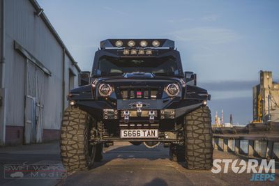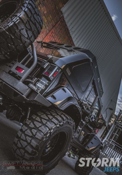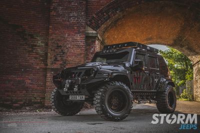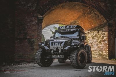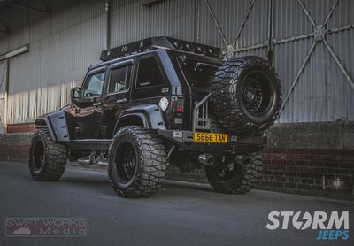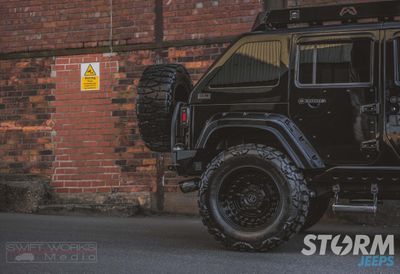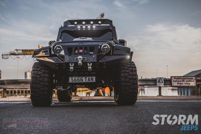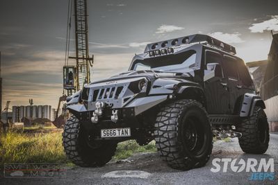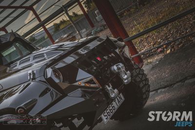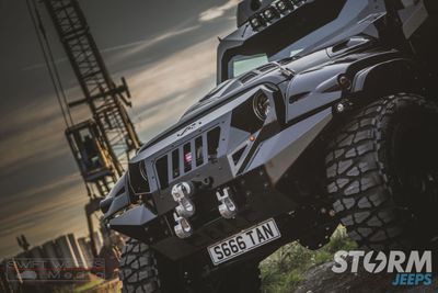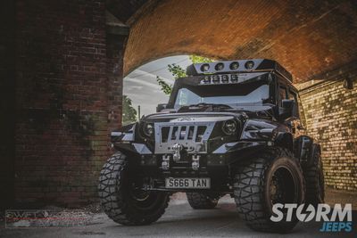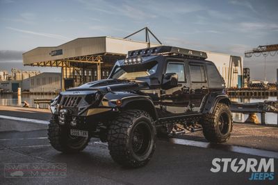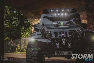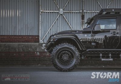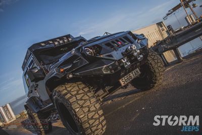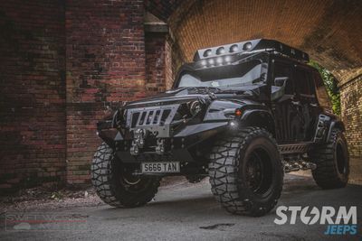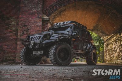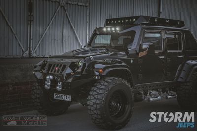 Underneath the now unrecognisable exterior, this vehicle started out as a 4 door Wrangler Rubicon. Aesthetically, the Jeep has been completely transformed. The DV-8 fast-back hardtop, Bushwacker extended pocket flares, Fab Fours full width grumper bumper, vicowl and body armour give this Jeep unrivalled road presence. The perfect vehicle for those who like to stand out, further visual enhancements are present in the form of black-out LED headlights, avenger hood 4.5” AEV lift and monster 20×12” black rhino wheels with 38×15 Nitto tyres. Check out the Storm build specifications and the gallery to fully appreciate what an achievement this vehicle is for Storm Jeeps.