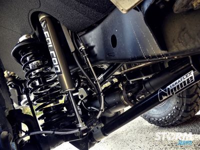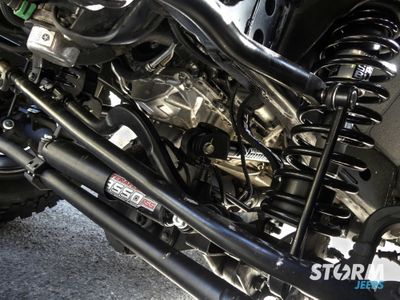 A Teraflex VSS9550 HD steering damper helps to reduce any imbalance through the steering, and is re-located above the tie bar using Teraflex steering damper relocation kit.