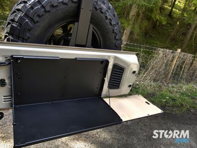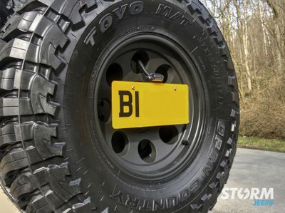 A Rugged Ridge HD cast hinge tyre carrier, enables mounting of the 37” tyre with the low profile rear bumper.