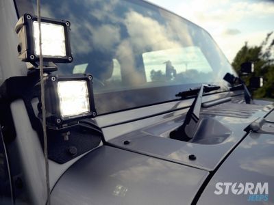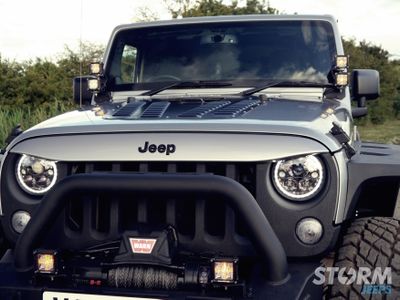 Additional Rugged Ridge LED cube lights have been added to the windscreen pillar and front bumper. These are controllable by switch panel in the car and have dual function. These lights are dual function providing powerful nighttime illumination on main beam and a secondary function cool-looking running lamp allowing you to be seen without blinding other drivers.