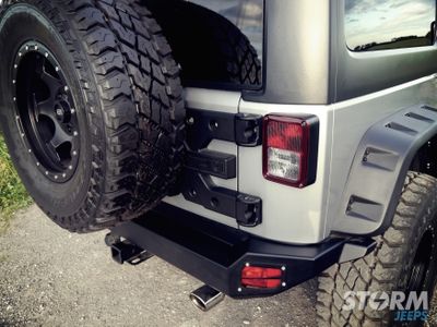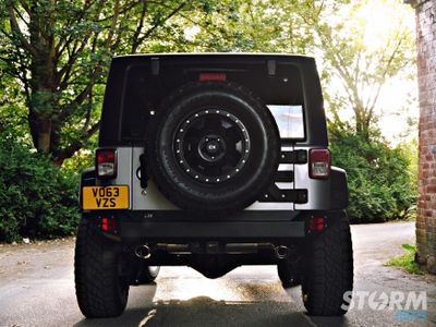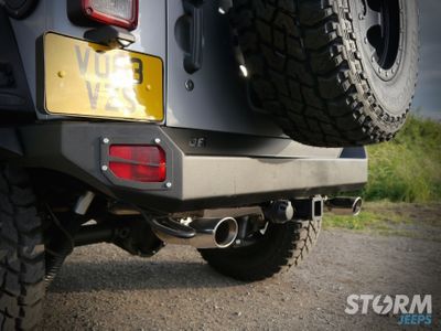 At the rear features a D6 steel rear bumper with integrated fog lights and a Rugged Ridge HD hinged tyre carrier to properly support the larger tyres used without the need for a separate swing away bumper mounted tyre carrier. A stainless steel twin exit exhaust also complements styling at the rear.