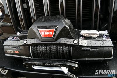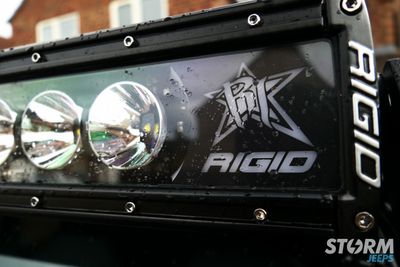 For additional off road lighting a full length 50” Rigid Radiance plus light bar is mounted along the top of the windscreen for serious light power controlled by pillar mounted switches within easy reach inside the Jeep. The Radiance light bar also features a red back light controlled by a seaports switch.