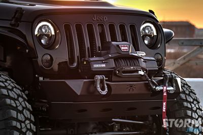 The Brawler Lite front bumper is a “mid-width”, high clearance bumper designed to combine hard core off-road performance with full features such as fog light mounts. This bumper is fabricated from 3/16” plate steel, CNC laser-cut and precision brake-formed into a low profile, high clearance design. The ends of the bumper extend far enough to protect the lower corner of the JK grille, but not far enough to hinder tyre clearance or tyre access to vertical obstacles. The bumper mounts a premium quality Warn Zeon 8000lbs winch with synthetic rope and a Poison Spyder Customs rope fairlead.