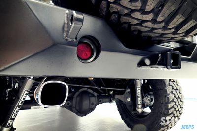 The 37” spare wheel is supported by a Rugged Ridge cast alloy heavy duty tailgate hinge with a halo LED brake light mounted in the wheel.