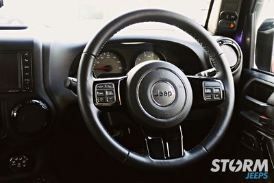 In the cabin, the Wrangler Night Eagle gets leather seats and a Leather wrapped steering wheel with Diesel Grey accent stitching and Piano Black painted bezels.