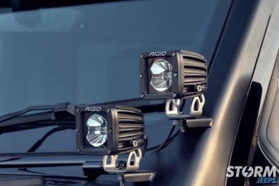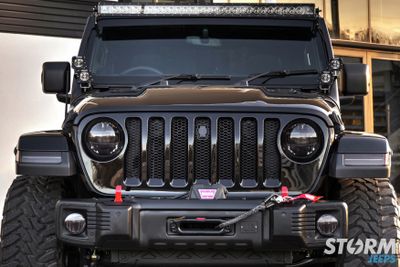 This Storm Jeep has been fitted with an impressive array of LED lights. ZRoadZ light bar brackets that accommodate a Rigid Radiance 50” roof level LED light bar and 4 off LED cube lights. These Rigid Radiance lights also features a white back light that can be used as a running light.