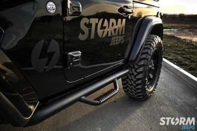 The Rugged Ridge Spartan Nerf bars are the ideal solution for JL offering a little help climbing into this lifted lifted Jeep without sacrificing that aggressive off-road attitude. These Spartan Nerf Bars feature a 3-inch OD primary tube that fits in a higher position than conventional tube steps offering a cleaner look, while patented drop-down step hoops at each door gives you firm footing for easy entry & exit.