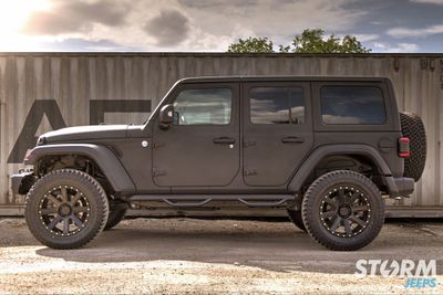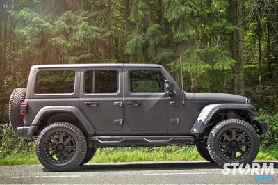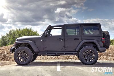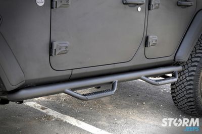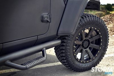 The Rugged Ridge Spartan Nerf bars are the ideal solution offering a little help climbing into this lifted Jeep without sacrificing that aggressive off-road attitude. These Spartan Nerf Bars feature a 3-inch OD primary tube that fits in a higher position than conventional tube steps offering a cleaner look, while patented drop-down step hoops at each door gives you firm footing for easy entry & exit.