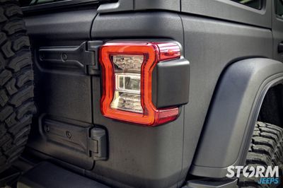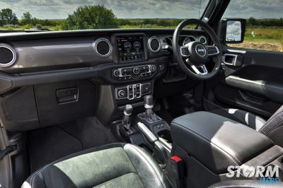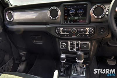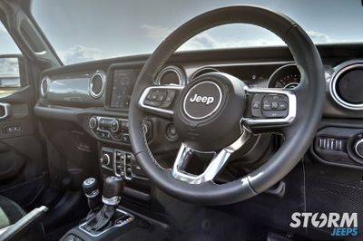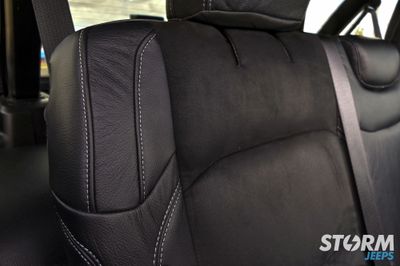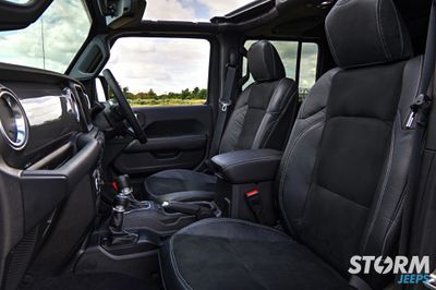 The new Wrangler JL interior is a huge step forward from the previous JK model, refined and technology packed as standard. However to give the Jeep a more luxurious high end appeal, the interior seats have been re-trimmed in a combination of black leather and Alcantara with white stitching throughout matching the steering wheel, centre console and door arm rests . You’ll find Alcantara in lots of high-end cars, It’s a fantastic-looking, durable product, Despite having a similar appearance to suede, Alcantara can endure much harsher environments without spoiling its soft and silky characteristics. Heated front seat elements can also be found in these re-defined seats.