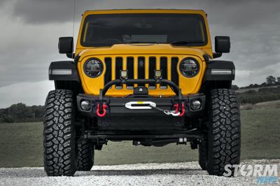 The Rugged Ridge Arcus stubby recovery bumper features 1-inch thick recovery hooks cross-drilled so they accept both 7/8 and 3/4 inch D-rings. Clever recesses in the bumper offer direct frame access for effective lifting of the Jeep with a hi-lift jack. The bumper accommodates a hoop with Rugged Ridge LED cube lights, LED fog lights and the winch plate mounts a Rugged Ridge Trekker 12000lbs winch with synthetic rope which has been placed lower for greater airflow to the radiator.