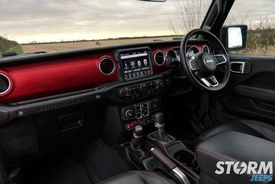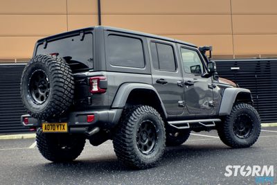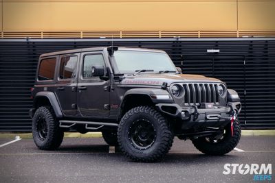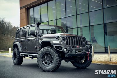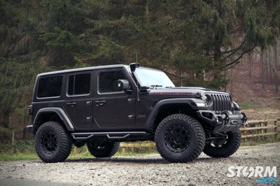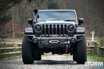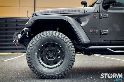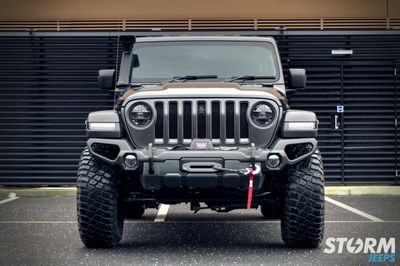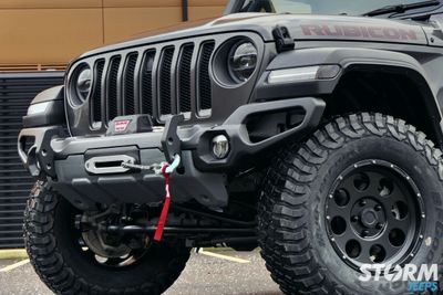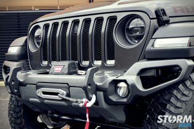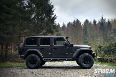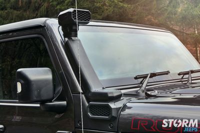 This Storm Jeep also features a Rugged Ridge AmFib Raised air intake snorkel. Just one look at this product and you know this is not your typical snorkel. The snorkel blends seamlessly with the factory cowl panel and instantly becomes the focal point that you can’t take your eyes off of. The entire system and its components look “at-home”, as though they we’re part of the Jeeps original design. But where the rubber really meets the road is where the AmFib Snorkel truly shines with cooler air delivered to the engine and increased intake hight providing insurance against a hydro locked engine when the water gets deep.