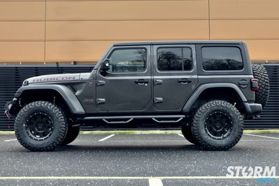 The Rugged Ridge Spartan Nerf bars are the ideal solution offering a little help climbing into this lifted Jeep without sacrificing that aggressive off-road attitude. These Spartan Nerf Bars feature a 3-inch OD primary tube that fits in a higher position than conventional tube steps offering a cleaner look, while patented drop-down step hoops at each door gives you firm footing for easy entry & exit.
