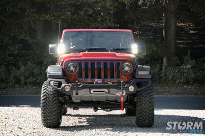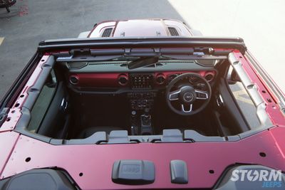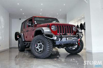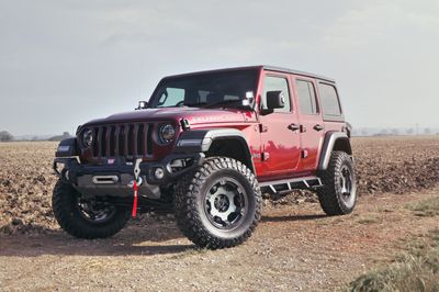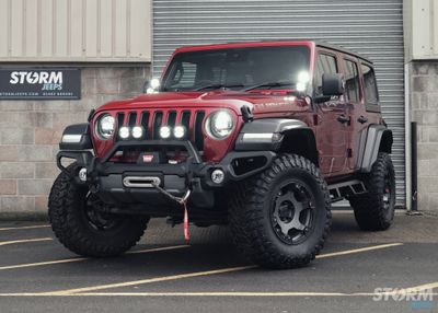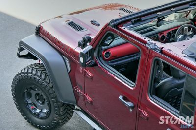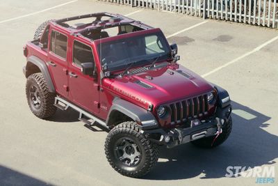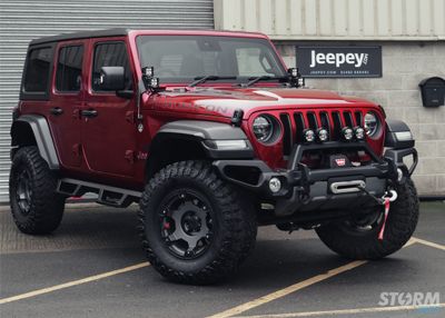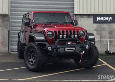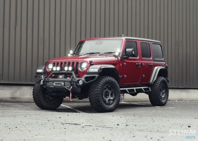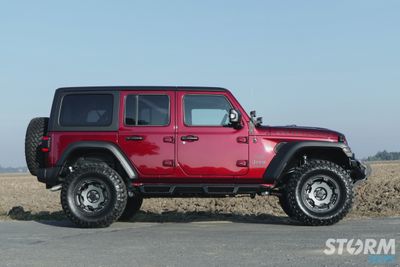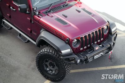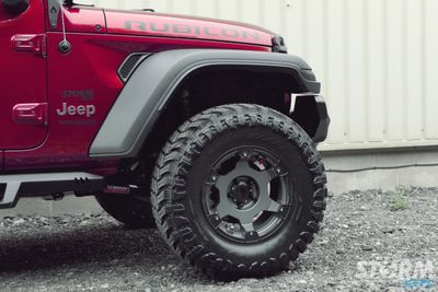 The increased suspension height clears room for chunky 35×12.5” Atturo Trailblade MT tyres mounted to 17 × 8.5” Gunmetal Teraflex Nomad wheels with black rash rings. These cast alloy wheels feature a reinterpretation of the classic six-hole design. Engineered with a “form follows function” philosophy resulting in a technical look complement the Jeep aesthetics perfectly. The rash rings offer 2 piece styling as well as protecting the wheel from trail carnage or even parking lot damage.