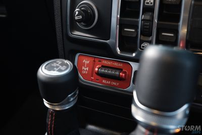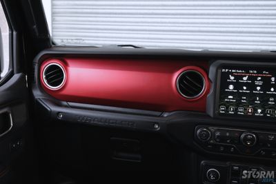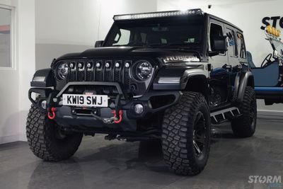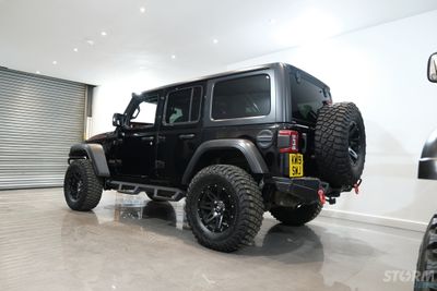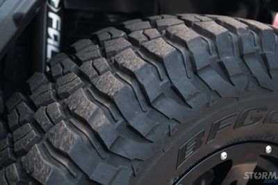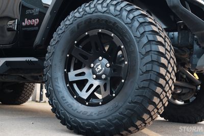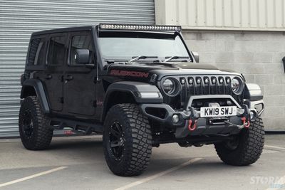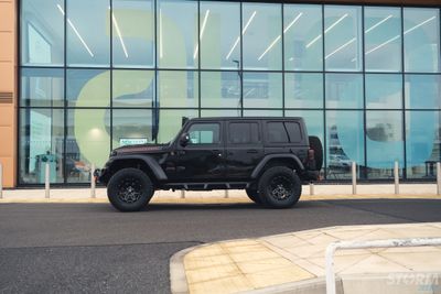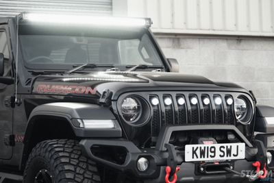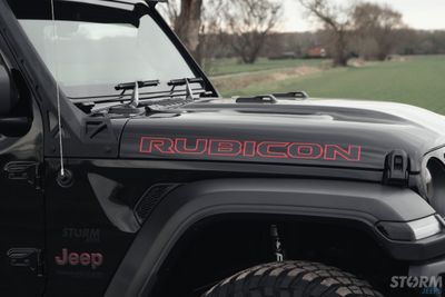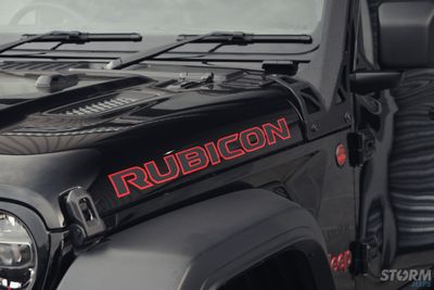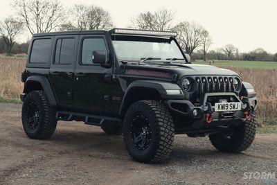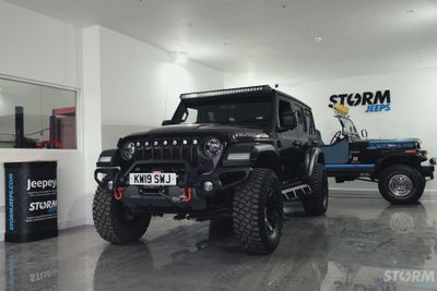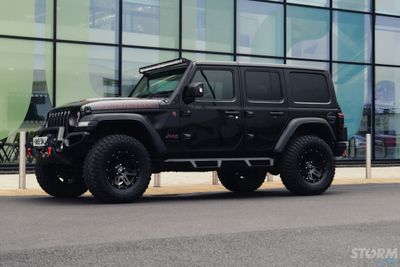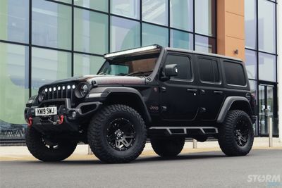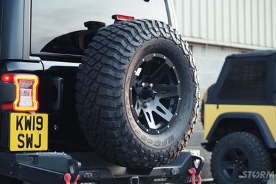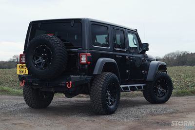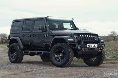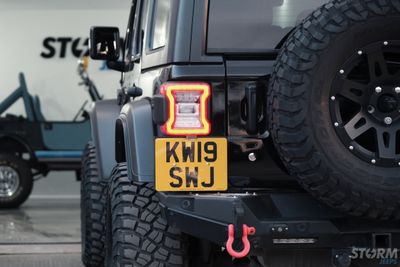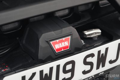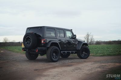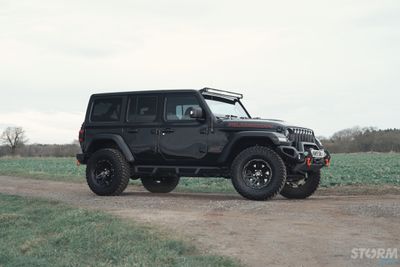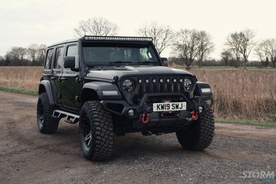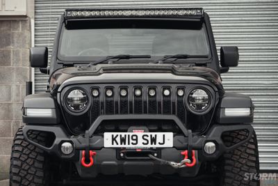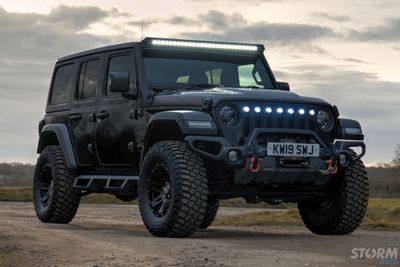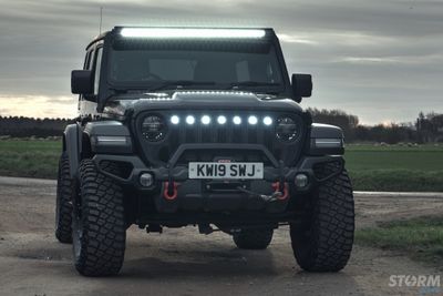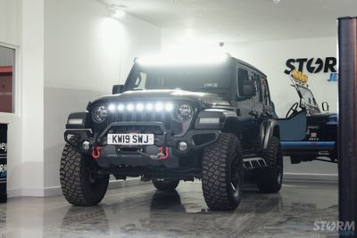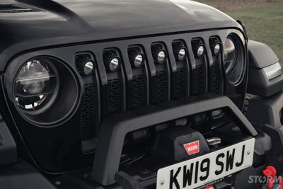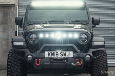 This Storm Jeep has been fitted with an impressive array of LED lights. Dv8 light bar brackets that accommodate a Rigid Radiance 50” roof level LED light bar. This Rigid Radiance light also features a white back light that can be used as a running light.