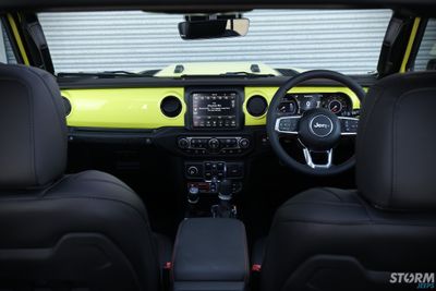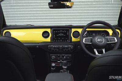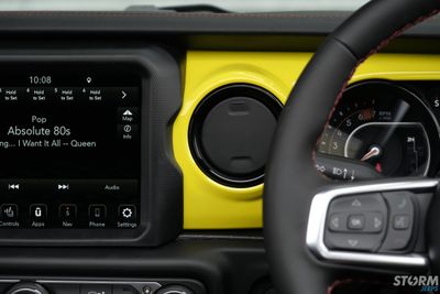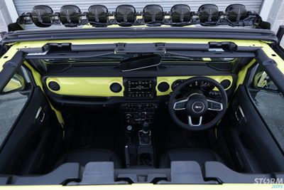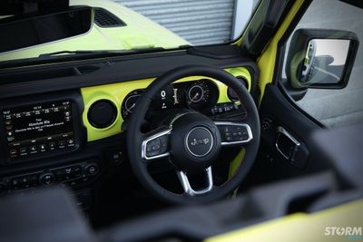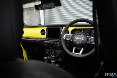 The original red Rubicon dash has been colour matched to the Jeeps High Velocity exterior colour.