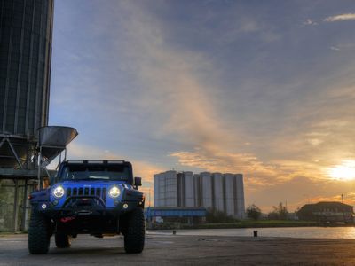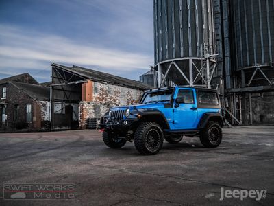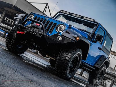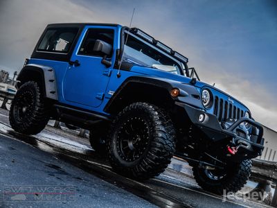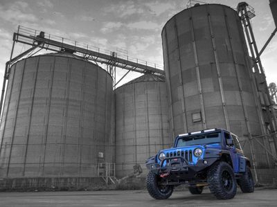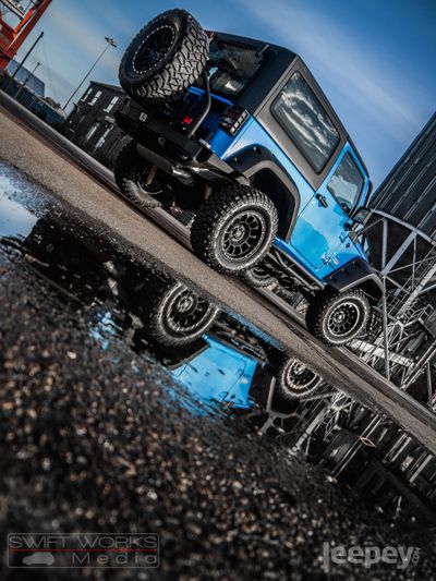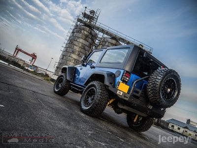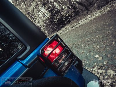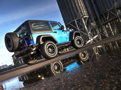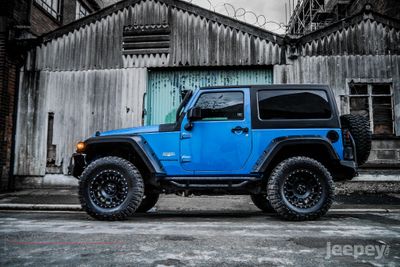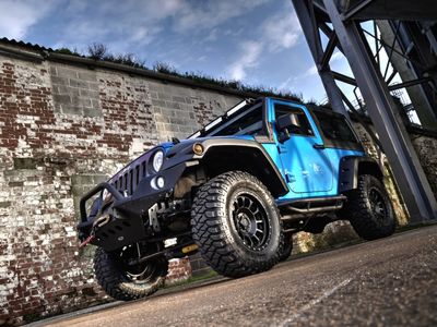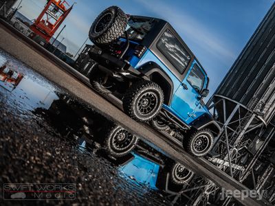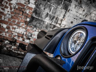 The blue and black theme runs throughout the Jeep. Supplied with either the aggressive Spartan Grille or the original Jeep seven slot grille with black accents. Other black accents include, Black fuel cap cover, Black rear light guards, Black cowl covers, Black tinted hardtop.