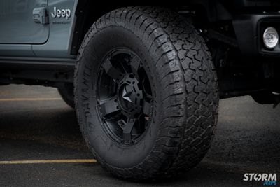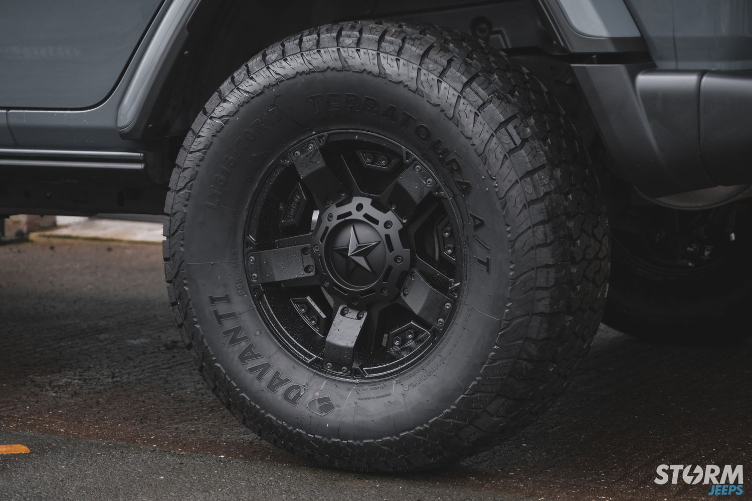 17” Rockstar II wheels by KMC are a 1 piece cast alloy featuring a familiar five spoke design, deep aggressive lip and spoke inserts, the Rockstar II has taken the 4wd truck scene by storm. l perfectly complement the custom Jeep and are wrapped in a 315/70R17 Terratoura A/T Tyre which is designed as an all-weather, all-terrain tyre that offers market-leading traction, control & debris ejection giving balance of highway and off-road performance.
